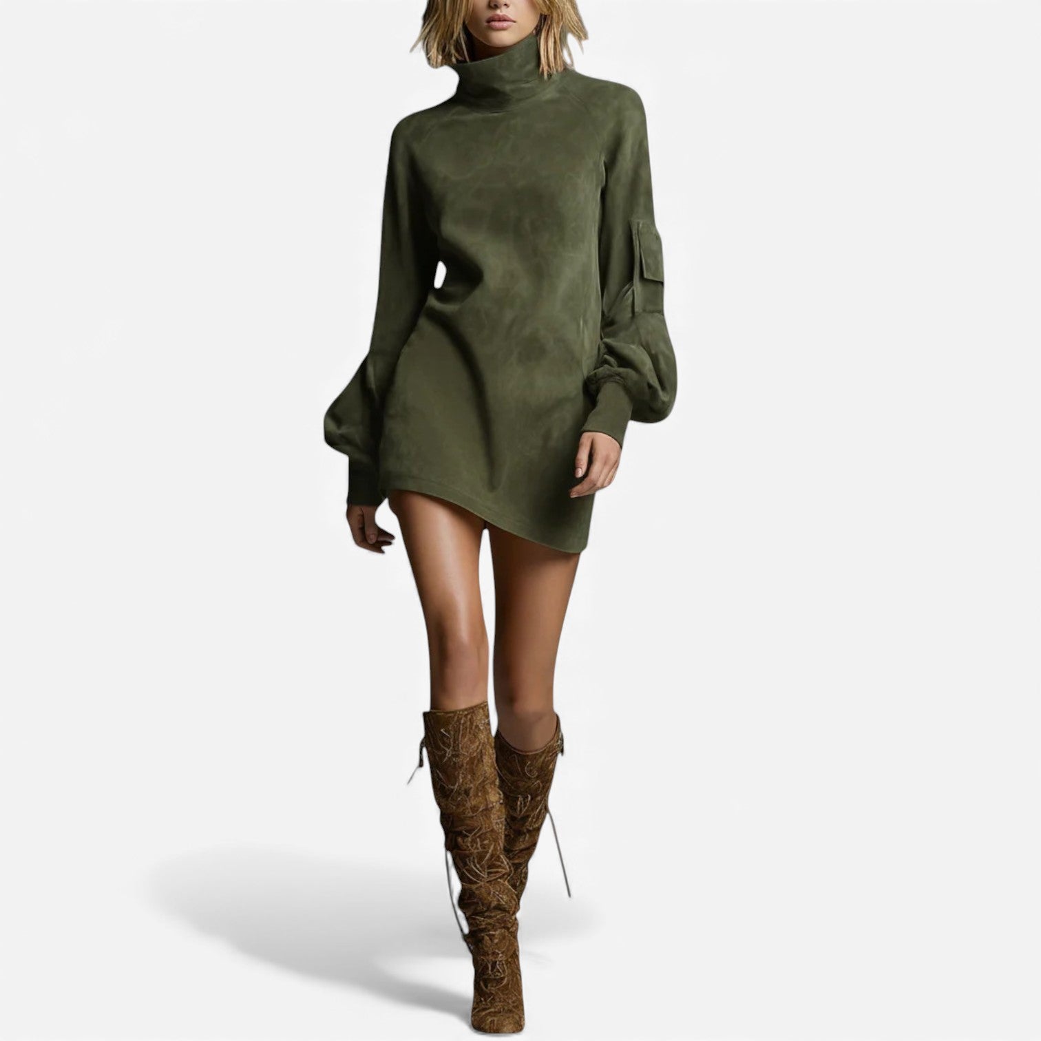 María™ es un vestido jersey de cuello alto con textura de ante suave, diseñado para ofrecerte comodidad y una sofisticación natural. Su largo mini relajado te permite lucir un estilo sencillo y chic, ya sea que estés paseando por la ciudad o relajándote en una cafetería. Con su cuello alto y su suave caída, esta prenda es perfecta para el clima frío y para combinar con capas con estilo.