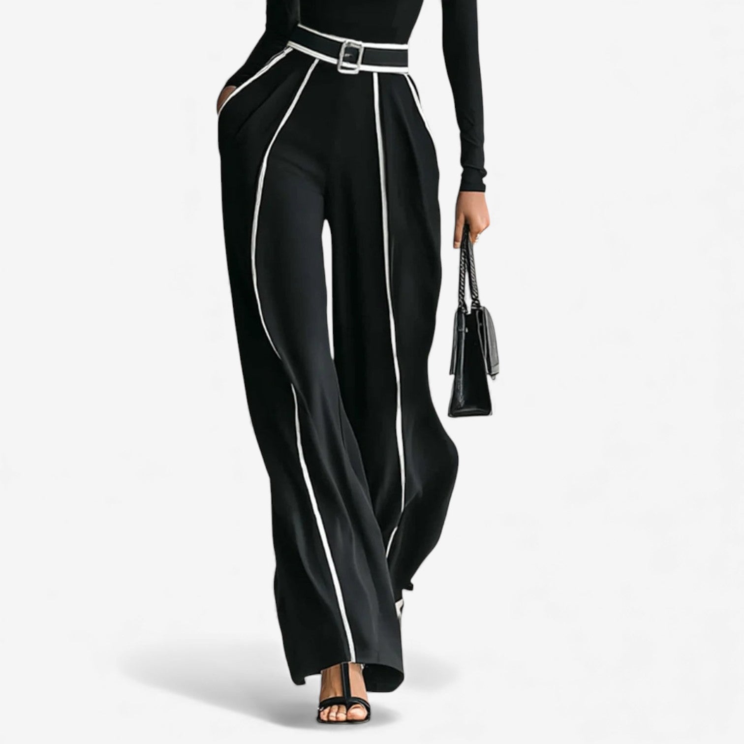 • Silueta de cintura alta con cinturón que favorece y alarga la figura.