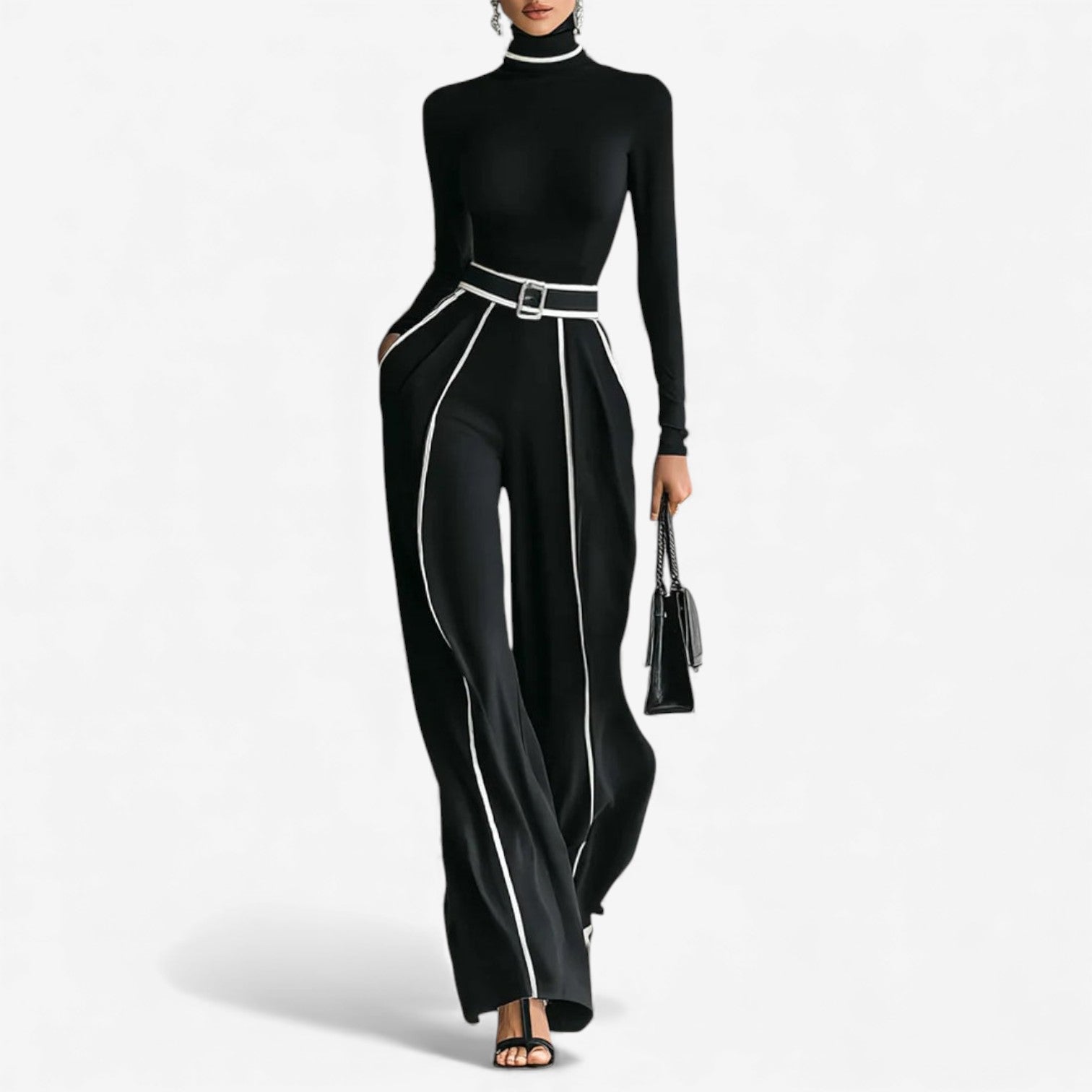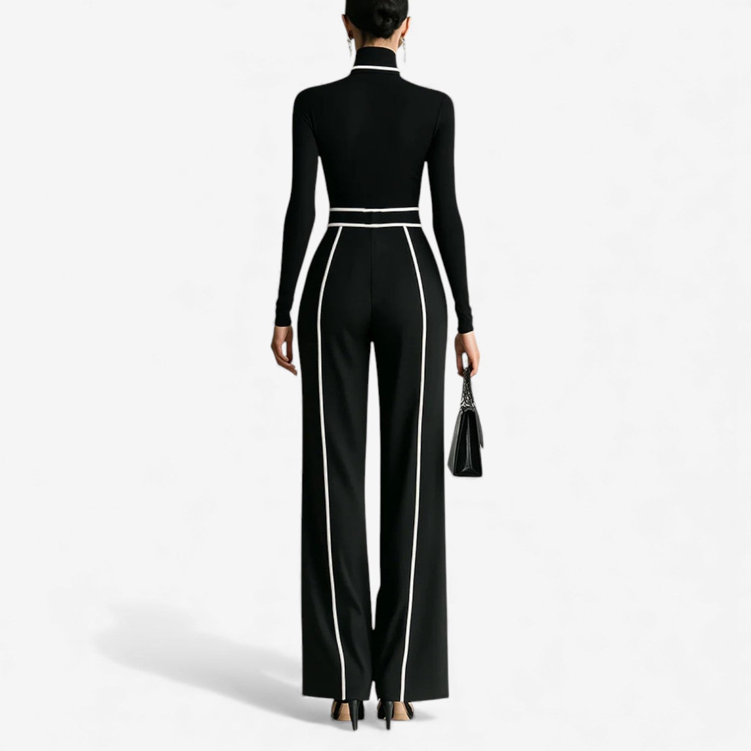 Sonia™ ​​es un mono fluido y refinado, diseñado para combinar comodidad con un estilo impactante y contemporáneo. El top ajustado de cuello alto contrasta a la perfección con los pantalones anchos y sueltos, creando una silueta larga y elegante. Con su diseño bicolor y su cintura con cinturón definido, es perfecto para esos días en los que buscas un estilo elegante y desenfadado con un toque moderno y audaz.